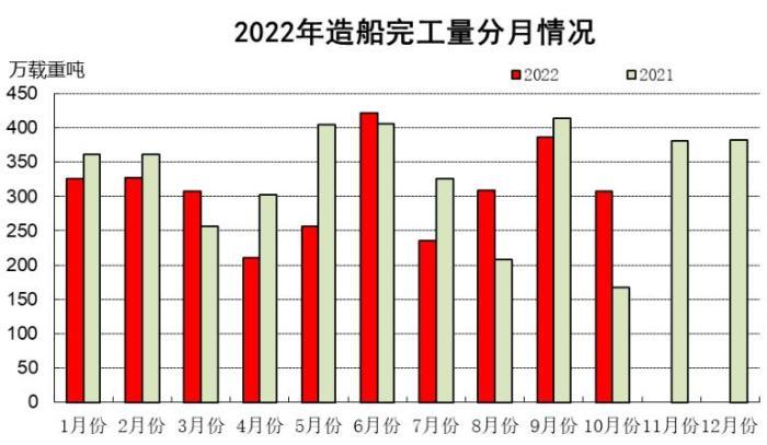 全国完工出口船2592万载重吨,同比下降13.4%;承接出口船订单3388万载重吨,同比下降39.0%;10月末手持出口船订单9337万载重吨,同比增长6.6%。出口船舶分别占全国造船完工量、新接订单量、手持订单量的84.0%、90.6%和89.4%。